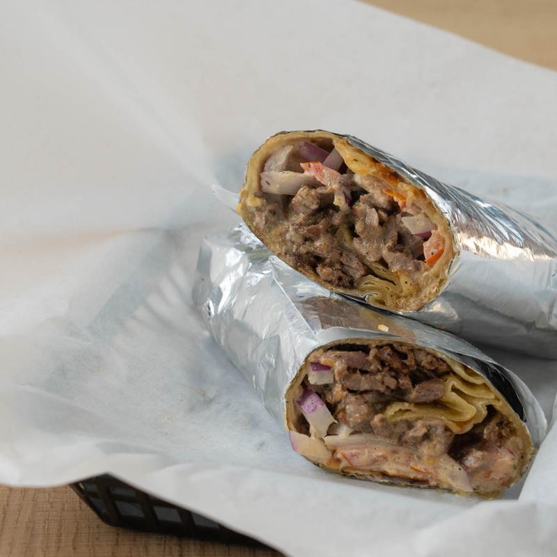 14" Tortilla Wrap with marinated steak broiled on a vertical rotisserie, thinly sliced. Topped with tomatoes, onions, parsley, and tahini sauce.